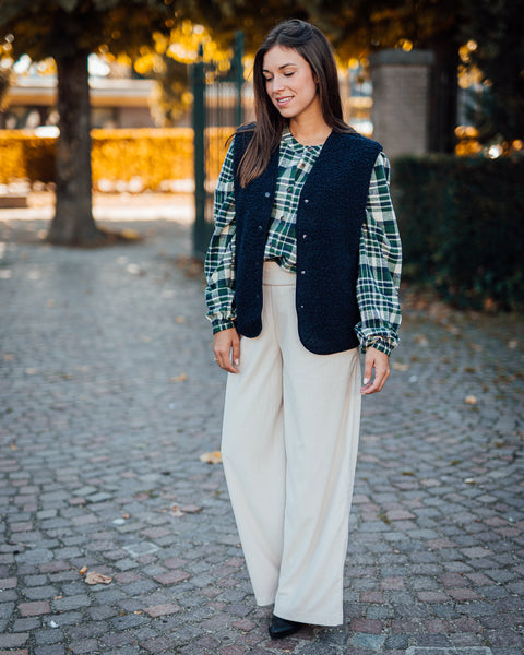 Het bekende Geggo model in een ribfluwelen versie. Valt niet zo ruim, als je wat breder van heup bent, neem je best een maatje groter dan normaal. Karolien draagt maat S.
