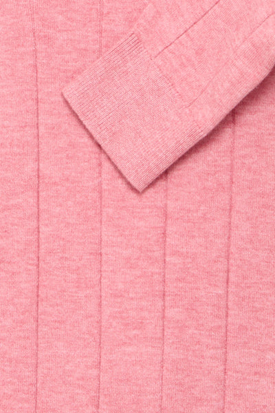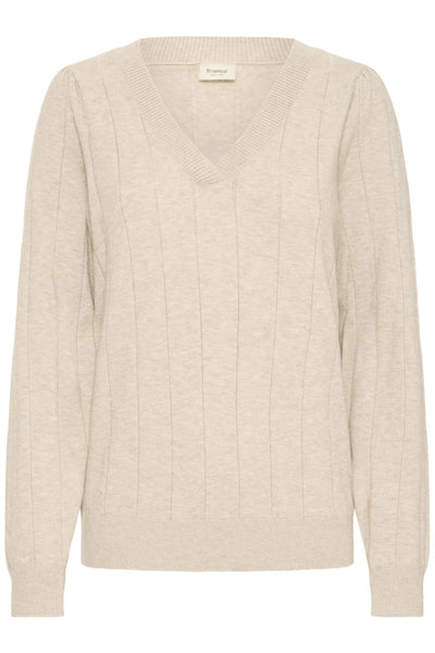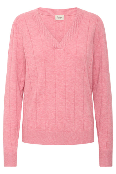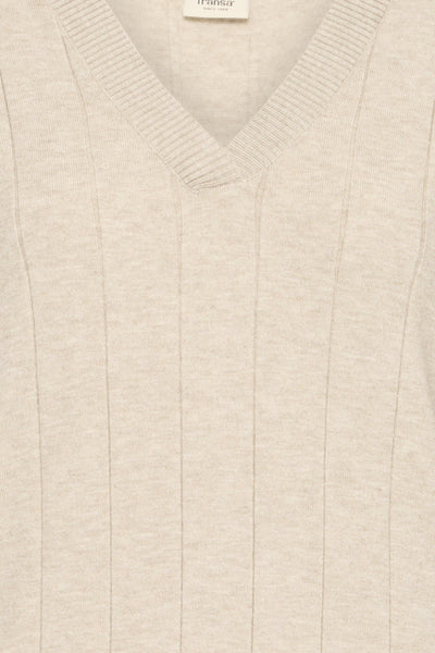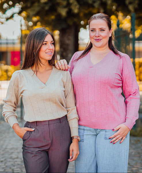 Zacht en dun pulletje met v-hals en verticale gebreide lijntjes. Karolien draagt maat XS, Silke maat L.