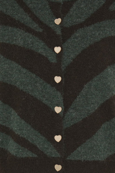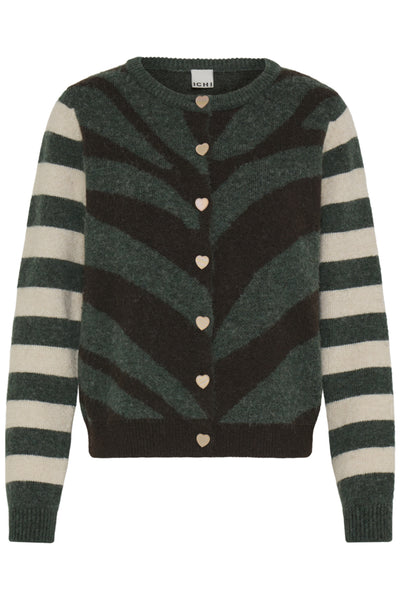 Hele zachte cardigan met gouden hartjesknopen. Combinatie van dennengroen, ecru en heel donkerbruin. Combineert mooi op onze Kate Sus pant in het donkergroen. Silke draagt maat XL.