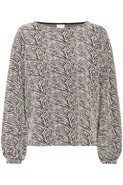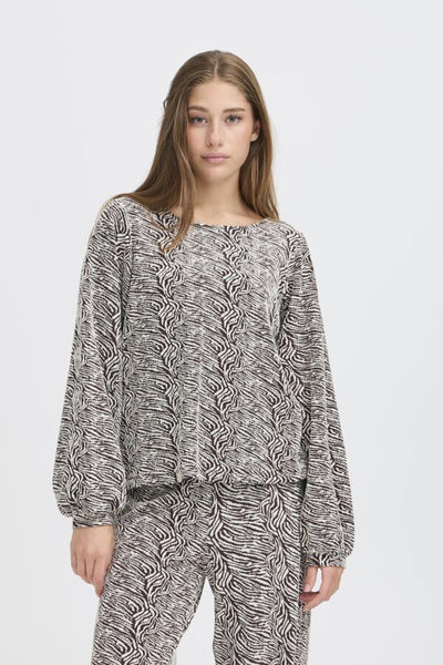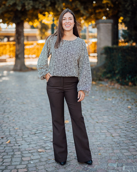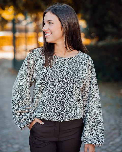 Zachte, dunne sweat met 3D zebramotiefje en lossere mouw. Karolien draagt maat XS. Combineert mooi met onze Lexi pant in het donkerbruin.