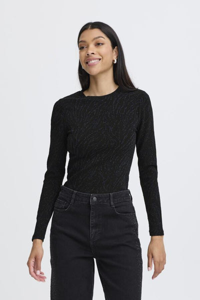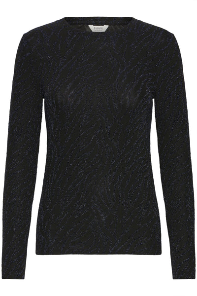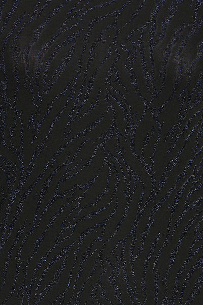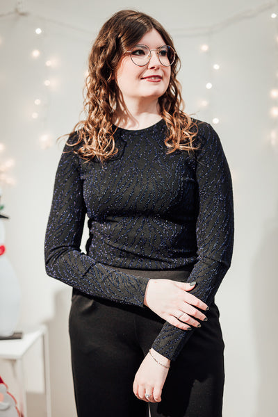 Aansluitend bloesje met paarsblauwe lurex zebrastrepen. Heb je niet graag echt heel strak en aansluitend? Neem dan een maatje groter dan normaal. Larissa draagt maat M.