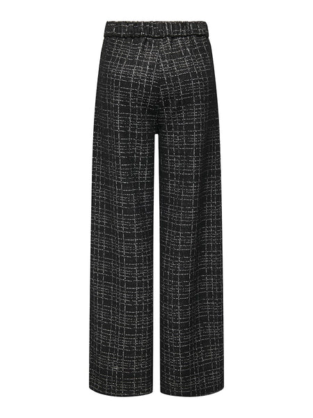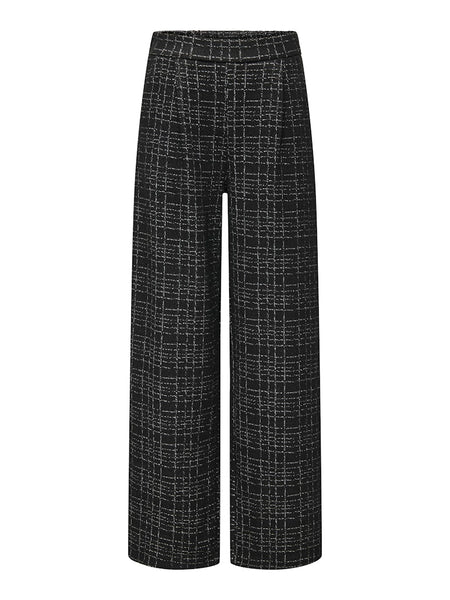 Geklede broek op elastiek van bouclé-achtige stof. Kan mooi gedragen worden als setje met de bijpassende vest die ook als top gedragen kan worden. Larissa draagt maat M, Silke maat L.