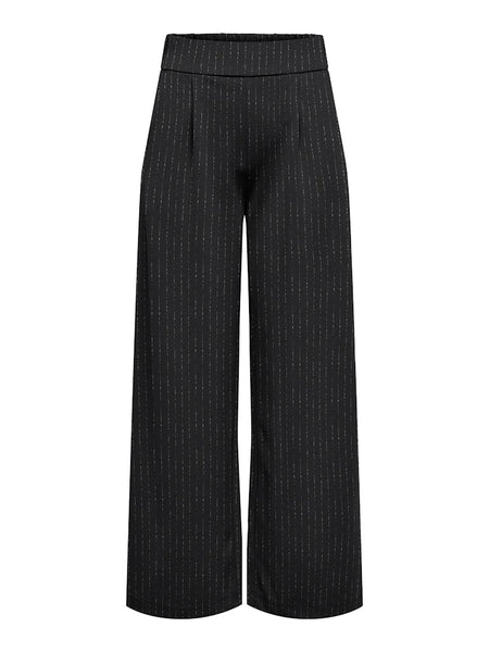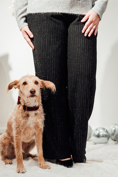 Comfy maar gekleed en feestelijk te dragen broekje met zilveren lurex krijtstreep. Larissa draagt maat L, Silke maat XL.