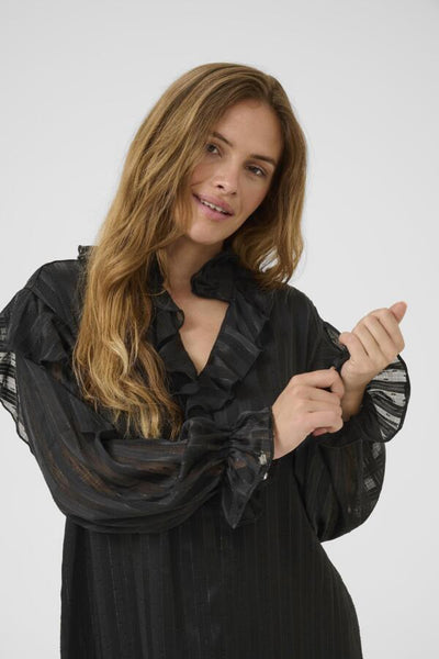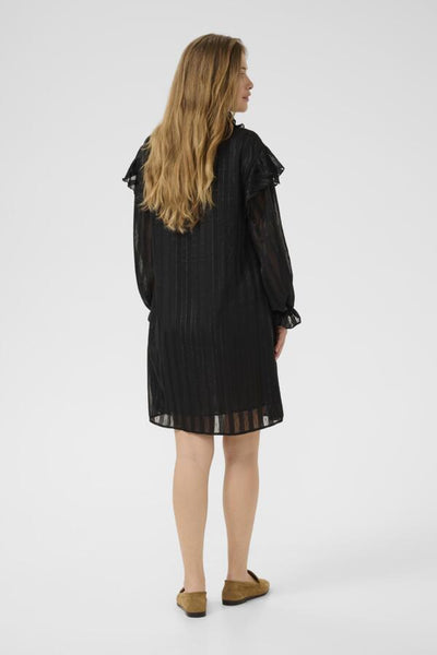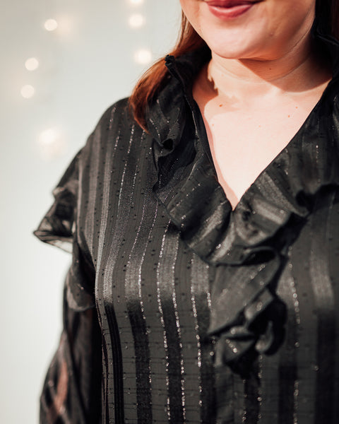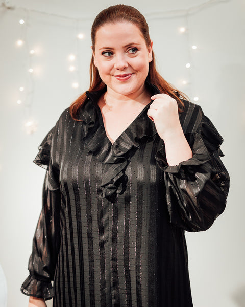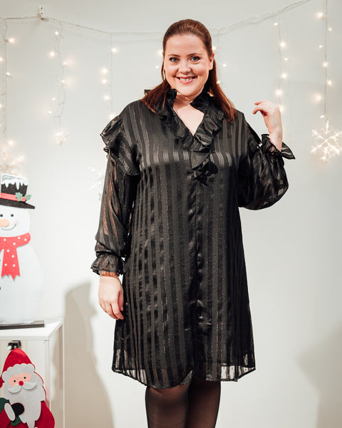 Recht kleedje met ton-sur-ton streepjes en lurex details. Mooie maar subtiele frullen aan schouders en decolleté. Silke draagt maat L.