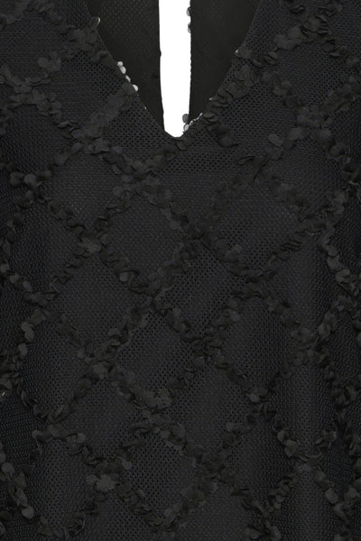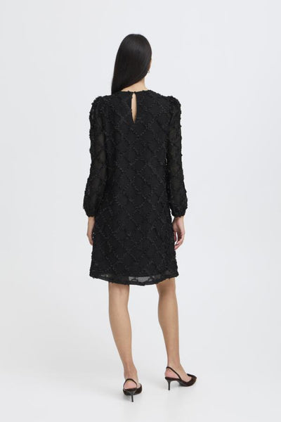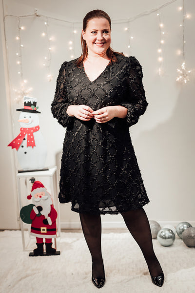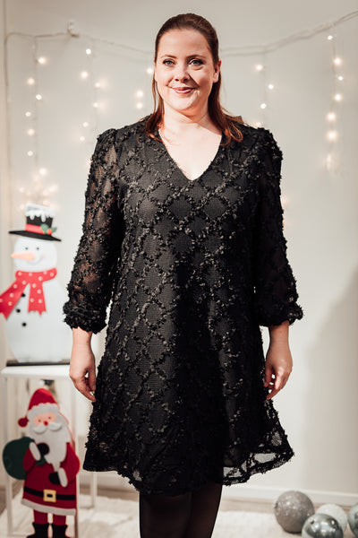 Licht a-lijn kleedje met zwarte opliggende opliggende bloemetjes in ruitjespatroon. Silke draagt maat 44.