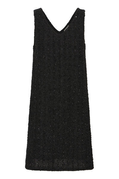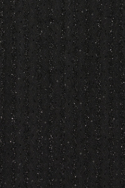 Toffe overgooier met zwarte verticale lurex. Hele toffe structuur, wat bouclé-achtig. Hier gecombineerd met ons glanzend Fasia hemdje, maar ook tof met een mesh bloesje of souspull onder. Larissa draagt maat M.