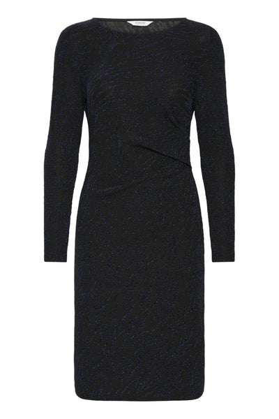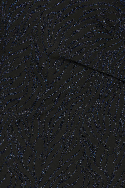 Kleedje met lange mouw en overslag effect en gedrapeerde stof in de taille. Mooie zwarte achtergrond met paarsblauwe lurex zebrastrepen. Silke draagt maat XL.