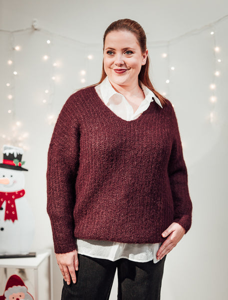 Zachte, grof gebreide pull met v-hals en lossere, gezellige fit. Combineert heel mooi met een hemdje onder zoals onze Anlizel hemd met 3D bloemen, of souspull zoals onze bordeaux gestreepte Alexandra. Larissa draagt maat S/M.