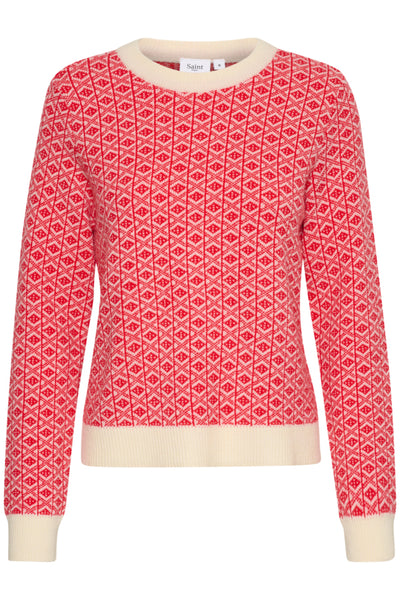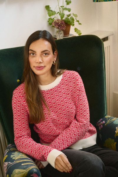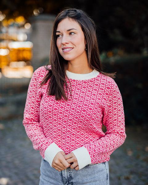 Pull zonder wol met mooie tekening in gebreid. Karolien draagt maat XS. Valt niet groter of oversized.