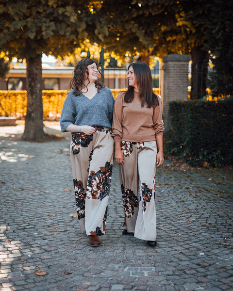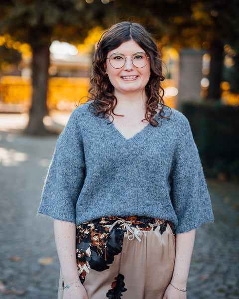 Tof pulletje met v-hals en 3/4e mouw. Kan ook heel mooi gedragen worden met een wit hemd onder. Hier gecombineer met onze Jannike satijnen broek. Larissa draagt maat S. Heb je niet graag los? Neem dan een maatje kleiner dan normaal.