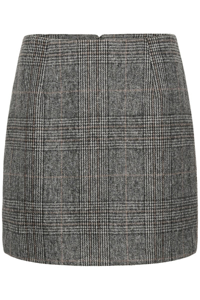 Wollen rokje met ruitjespatroon in grijs, zwart en camel. Daardoor heel makkelijk te combineren, bijvoorbeeld met onze dunne Lizza pull in het camel of dikkere Roxy pull in het lichtgrijs. Karolien draagt maat 34.