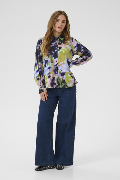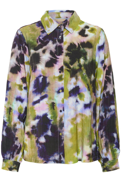 Tof hemdje met gewolkte print met verschillende kleuren. Daardoor heel makkelijk te combineren met verschillende onderstuks. Ook tof met een bleke jeans! Larissa draagt maat S.