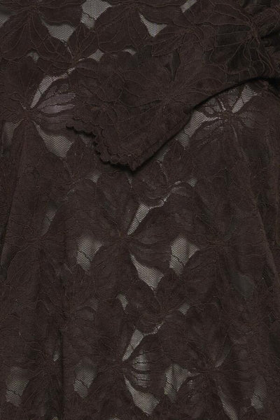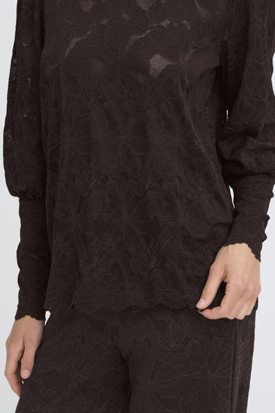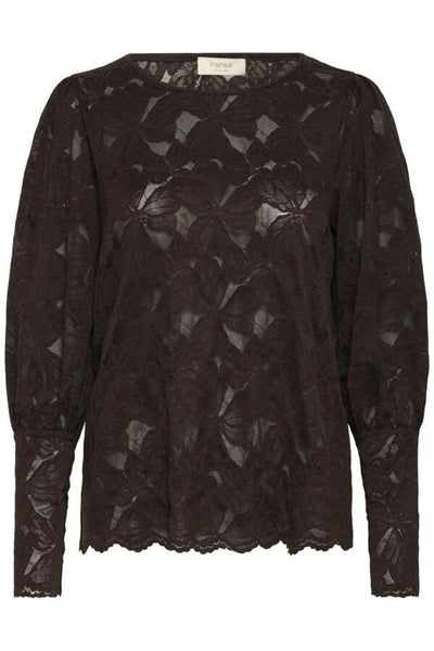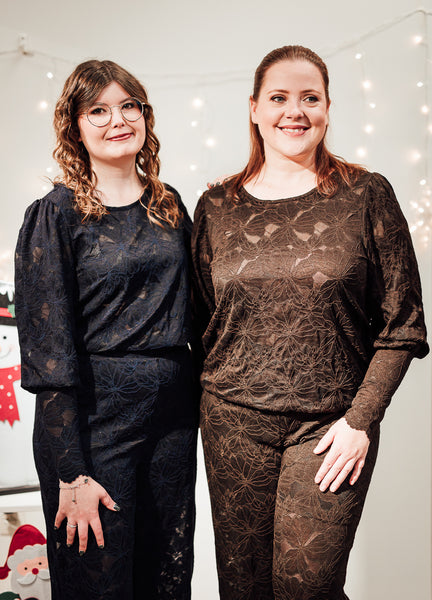 Kanten top met mooi afgewerkte golvende onderkant en lange mouw met lange aansluitende manchet aan de polsen. Larissa draagt maat S, Silke maat L. Draagt mooi als setje met de bijpassende broeken maar even tof op een effen broek.