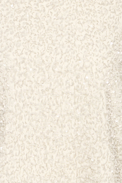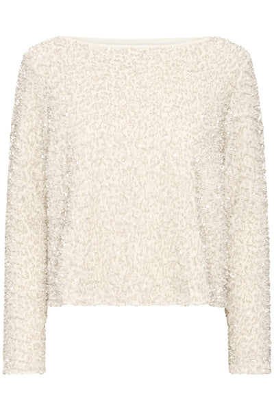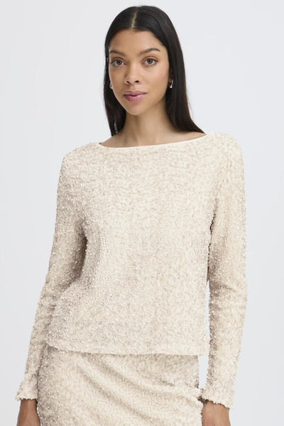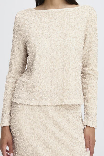 Bloesje met matte beige pailletten. Heel uniek! Geeft een feestelijk effect, maar is toch zeer draagbaar omdat het niet glinstert! Mouwen zitten strak, bloesje valt recht en heeft een lagere schouderinzet. Larissa draagt maat S. Mooi met onze ecru Denoa broek!