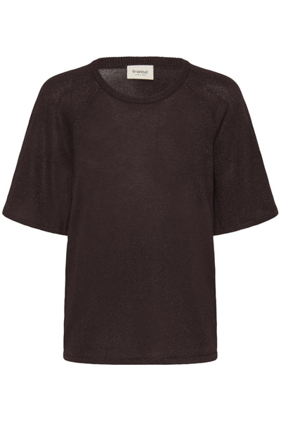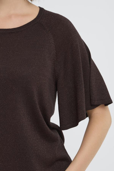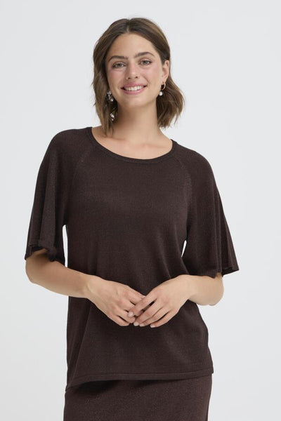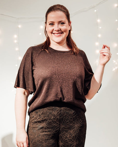 Dun gebreide top met lichte vlindermouw. Mooie bruine lurex, kan dus zowel feestelijk als casual gedragen worden. Ook tof in combinatie met onze kanten Mirabella broek in het donkerbruin. Silke draagt maat L.